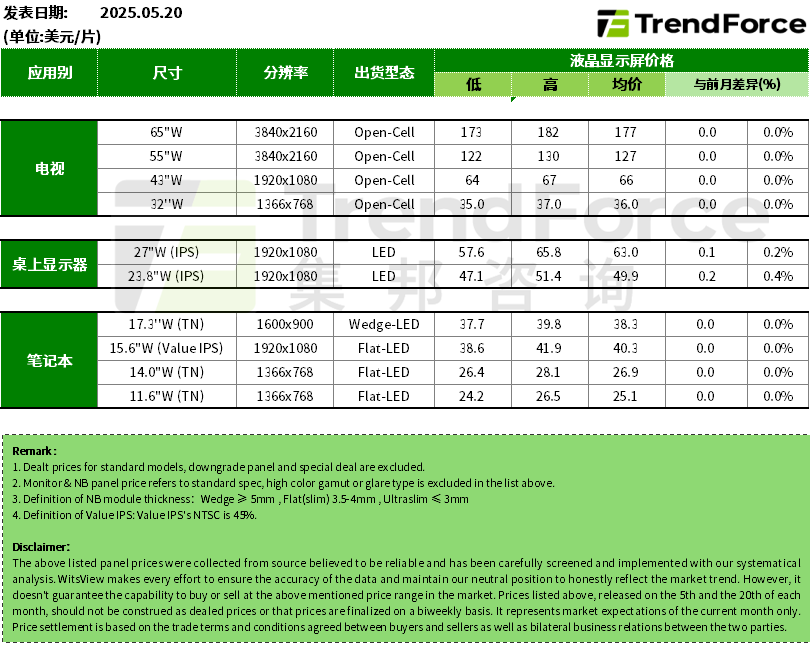 0 05-26 22:57TrendForce:5月,电视面板价格与笔电面板价格继续保持稳定,显示器面板价格小涨